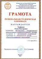 - I место дипломной работе на тему «Применение биогазовых технологий для систем газоснабжения сельскохозяйственных предприятий», выполненная Никулиным Николаем Юрьевичем под руководством д.т.н., проф. Кущевым Леонидом Анатольевичем.