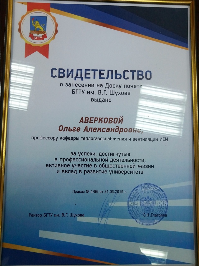 Поздравляем профессора, доктора технических наук кафедры «Теплогазоснабжение и вентиляция» Аверкову Ольгу Александровну с получением свидетельства о занесении на Доску почета БГТУ им. В.Г. Шухова за успехи, достигнутые в профессиональной деятельности, активное участие в общественной жизни и вклад в развитие университета.